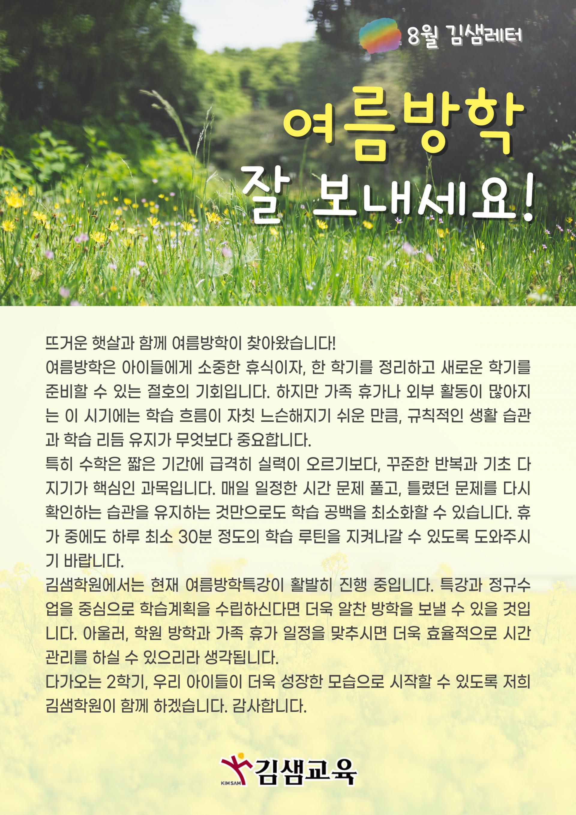 다가오는 2학기, 우리 아이들이 더욱 성장한 모습으로 시작할 수 있도록 저희 김샘학원이 함께 하겠습니다. 감사합니다.